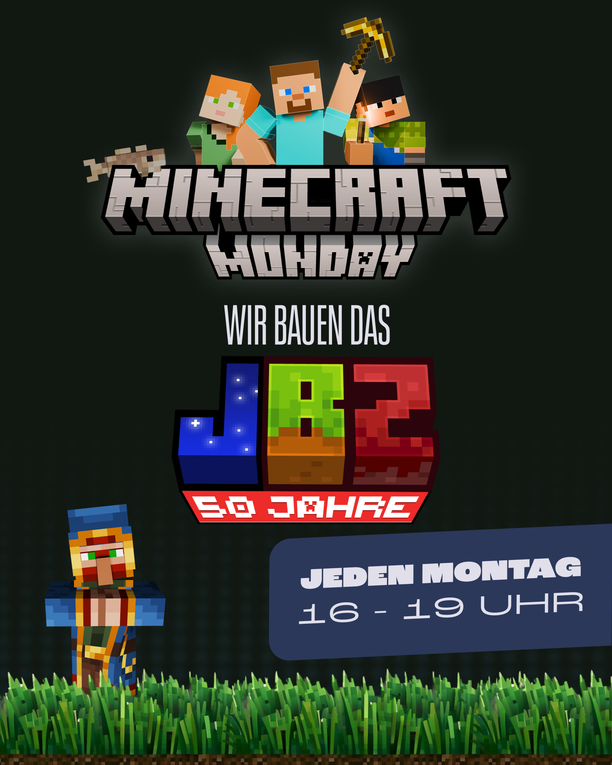 Bis zu unserem großen Jubiläum im Mai bauen wir gemeinsam das JBZ in Minecraft. Immer montags tauchen Ben und Uli mit euch in die JBZ Welt ein und erschaffen etwas richtig cooles! Dabei ist Teamwork gefragt, denn wir wollen das JBZ detailgetreu nachbauen! Da muss auch schon mal was ausgemessen oder die Gegend drumherum ausgekundschaftet werden.