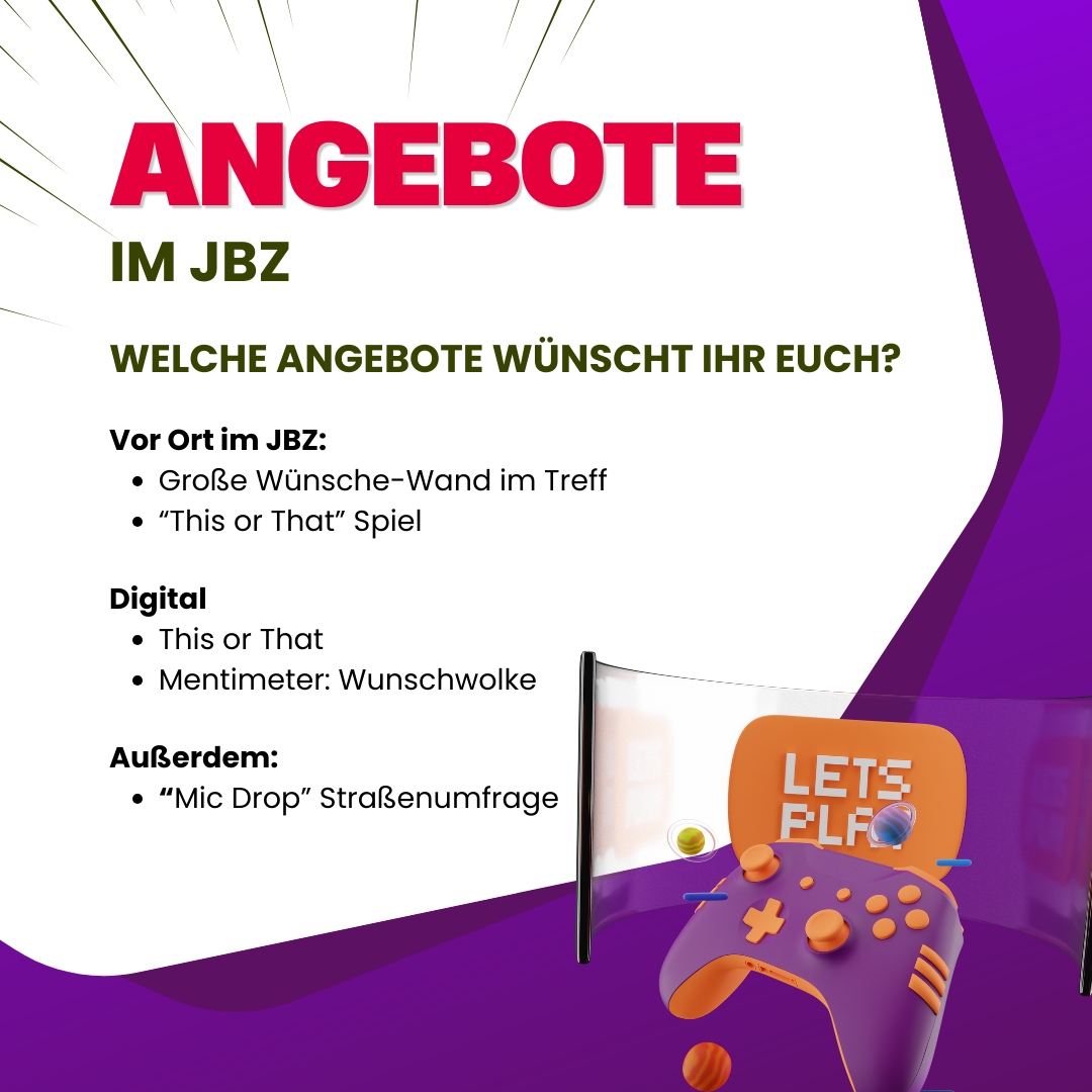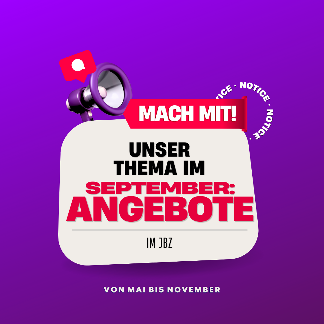Im September dreht sich alles um das Thema „Angebote“ im JBZ. Ihr habt Wünsche, Feedback oder Ideen? Dann bringt sie ab jetzt in unseren Formaten ein!